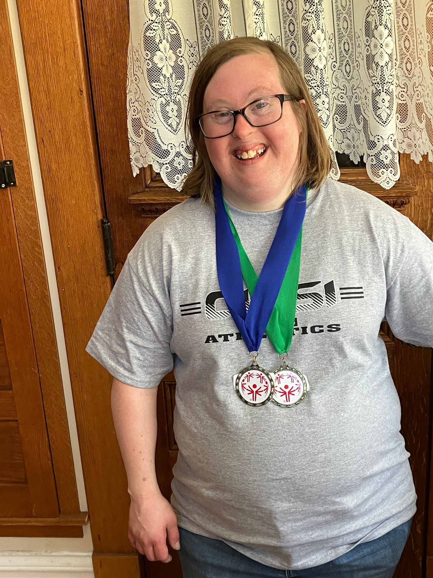 The Special Olympics oath states, “Let me win. But if I cannot win, let me be brave in the attempt.” Well let’s just say in the morning during the softball throw Kate was brave in the attempt. She finished fourth but threw about as well as she can.